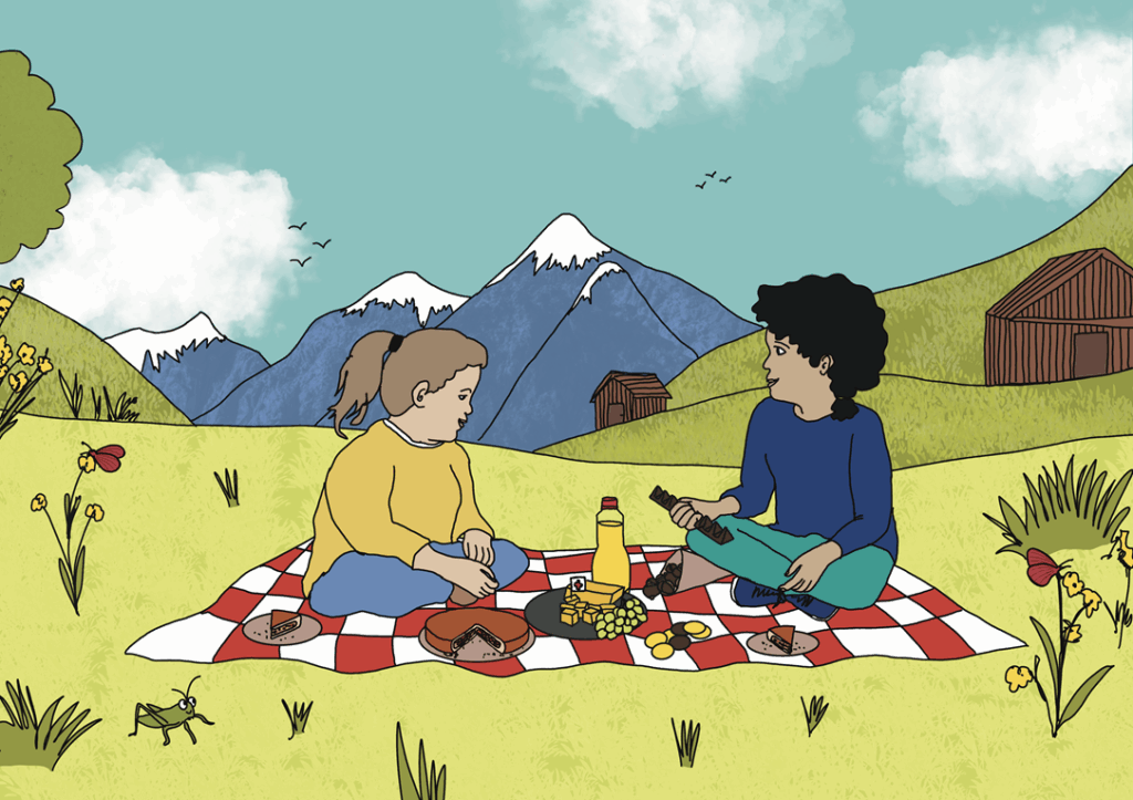 Die Schweizer Küche ist bodenständig, lecker und oft sehr gemütlich. Vor allem Käse spielt eine große Rolle. Viele Familien essen gerne Fondue, bei dem geschmolzener Käse über einem kleinen Rechaud warmgehalten wird, damit man Brotstücke eintauchen kann. Ähnlich beliebt ist Raclette, bei dem der Käse geschmolzen und über Kartoffeln gegossen wird. Auch Rösti, ein knusprig gebratener Kartoffelfladen, gehört zu den Klassikern. Und natürlich darf die berühmte Schokolade nicht fehlen, die man an vielen Orten in allen Formen und Geschmacksrichtungen findet. Für Kinder ist natürlich das Highlight.