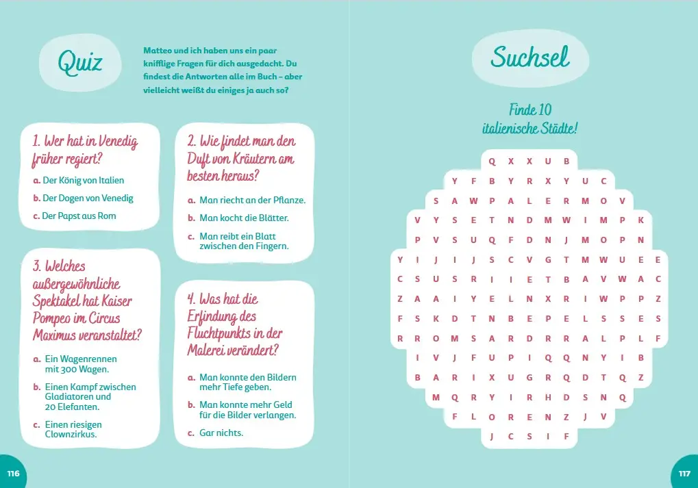 Mit spannenden Rätseln, lustigen Anekdoten und vielen Mitmach-Ideen wird dieser kindgerechte Reiseführer zum perfekten Begleiter – vor, während und nach deinem Italien-Abenteuer!