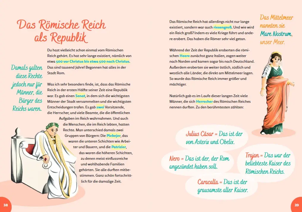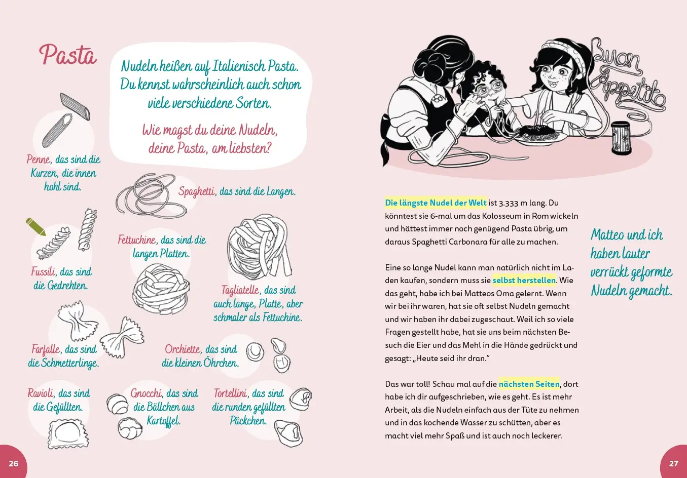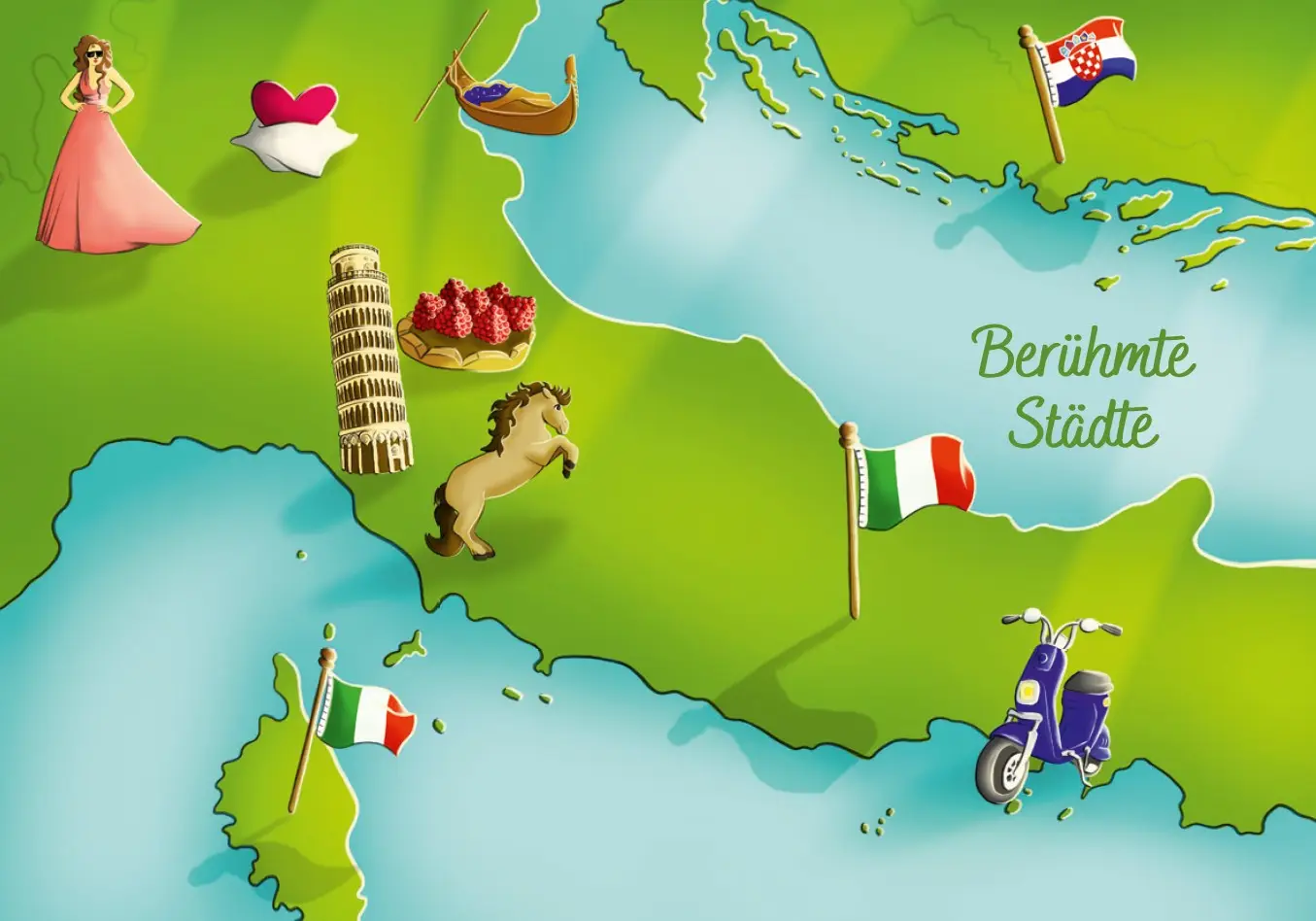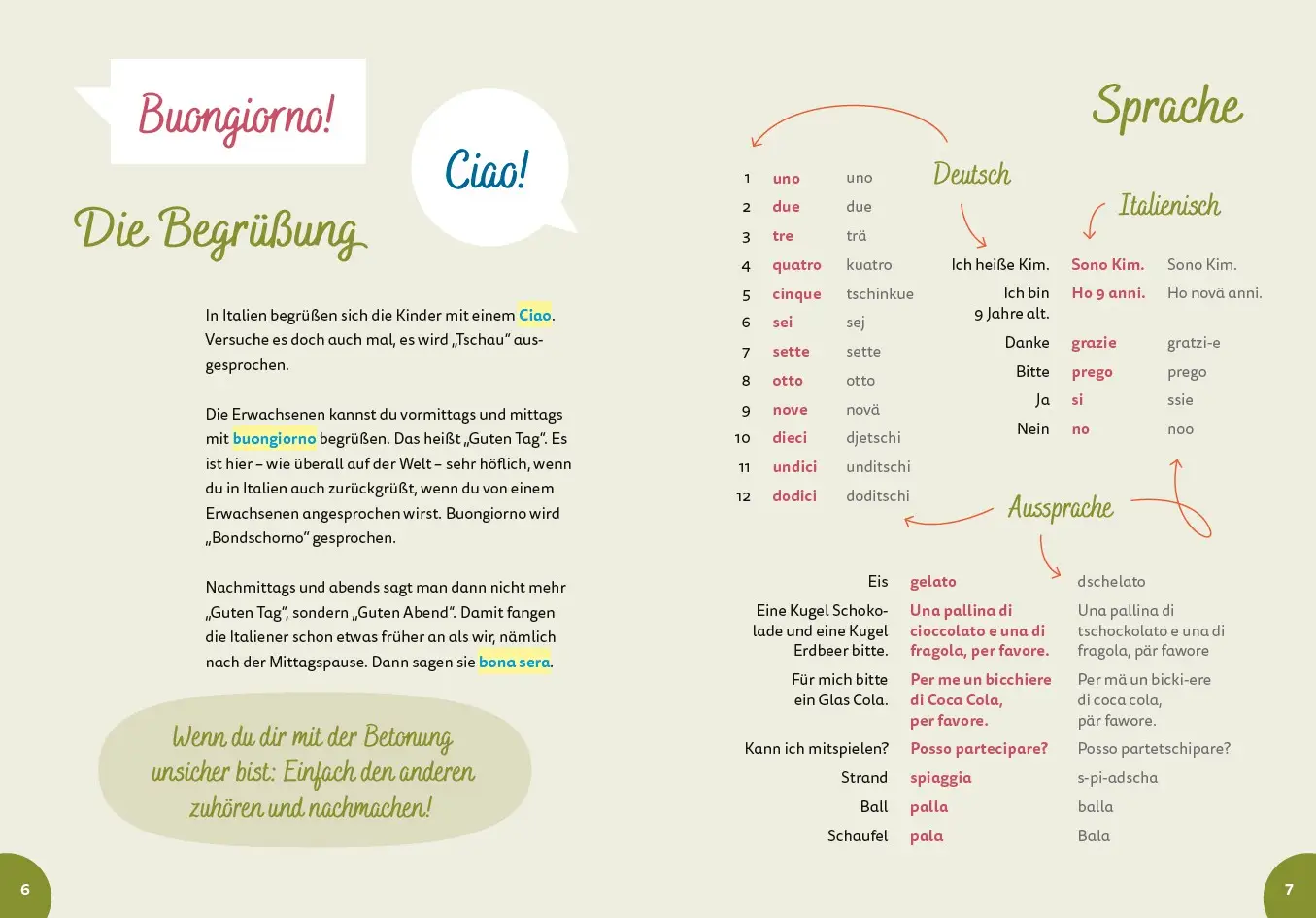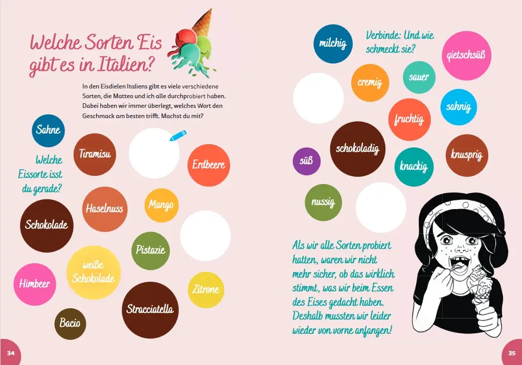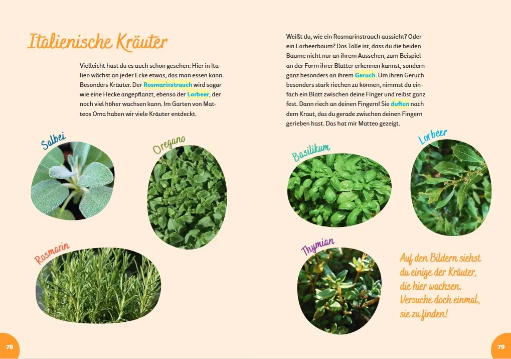 In „Italien for kids“ lernen Kinder spielerisch die wichtigsten italienischen Wörter, wie man selbst Pasta macht und was der Heilige Franz von Assisi mit Tieren zu tun hat. Außerdem erfahren sie, warum die alten Römer so wichtig waren, wie Künstler wie Michelangelo die Welt veränderten und welche Tiere in Italien leben.